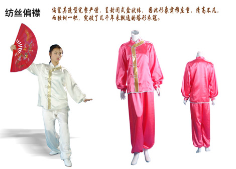 (偏襟)**偏襟起源于满族的旗装,外轮廓呈长方形,马鞍形领掩颊护面,衣服上下不取腰身,衫不露外,偏襟右衽以盘纽为饰,假袖二至三幅,马蹄袖盖手,镶滚工艺装饰,衣外加衣,增加坎肩或马褂。其造型完整严谨,呈封闭式盒状体,因此形象肃穆庄重,清高不凡,而独树一帜,突破了几千年来飘逸的塔形衣冠。时至今日,它对现代服装也有一定的影响。特别是随时代发展,经过加工曲线突出修长秀丽的旗袍,已经形成了汉民族的服饰代表,显示了东方女性的温柔与内涵,具有永恒存在的价值。偏襟的裁剪,产生了均衡的美感,体现了潇酒秀丽的审美情趣。微紧的腰部和两侧的开叉,恰到好处地表现了女性的曲线美。紧扣的高领下的盘花扣在整个服装上起到了画龙点睛的作用。每每看到这些工艺精细灵巧的服装,总是令人产生一种赏心悦目的快感。生活中,我们都有一种体会,每当穿上足以表现自己仪表美的时装时,一种称心如意快感油然而生,从而提高了生活的情趣,使我们精神焕发地投入到生活工作中去,这就是服装产生的审美价值。