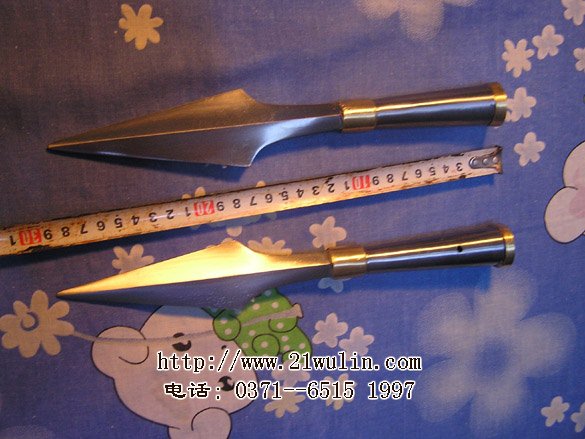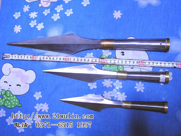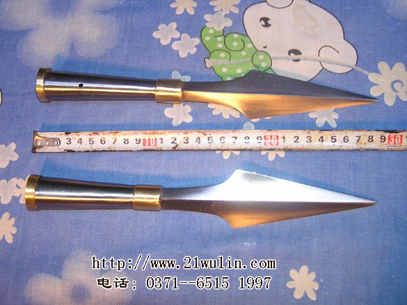 本大枪头硬度韧性特别好,枪管两端双环铜箍,传统流线形造型,美观大方,全长约30厘米,每幅:70元(赠红缨子两片)