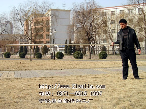 白蜡杆是天然绿色灌木丛生植物,它通体洁白、坚而不硬、柔而不折,杆身可弯曲到180度不劈裂,自身柔韧性强,纤维密度稠,有较强的自然拉力,在干燥的地方不劈裂,在潮湿的地方不变形,其弹性、韧性是其它木质不可比拟的,属绿色、天然、独特、稀有的特产,是加工武术器材及各种工具的理想天然原材料,深受国内外武术爱好者青睐;河南省宁陵县白蜡杆加工厂以“传统的工艺和先进的技术”为动力,充分利用这一独特资源的优势,把白蜡杆有弹性而折不断、有韧度而不变形、有力度而不震手等特性溶入技术开发中去,大胆采取高温熏蒸和现代工艺相结合的办法,彻底杀死深藏的蛀虫,精挑细选,精心加工后的杆子光滑锃亮、笔直成线。