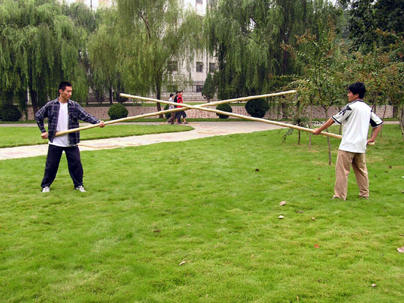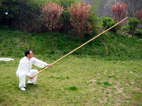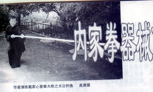 练心意大枪的杆子要在一丈左右,腊木杆(又称白蜡杆)越粗越重越好。练大枪之前,最好先抖一年的大杆子,掌握好“枪性”,练出丹田气和腰力,然后再练习圈枪、缠拿、崩抖等基本枪法。学习套路时要以丹田拿枪、转枪、抖枪, 配合步法和把位的移动,六合成一。外练大枪,内练丹田,直至用丈二以上的大杆子练习“顺风扯旗”、“太公钓鱼” 等枪式能够举重若轻,才能算是枪功入门。很多心意门和形意门的传人都想练出“抖擞劲”来,且为之毕生追 求。可惜,仅靠站桩和打拳是练不出“抖擞劲”的,抖大杆子、练大枪才是修炼“抖擞劲”的基础。