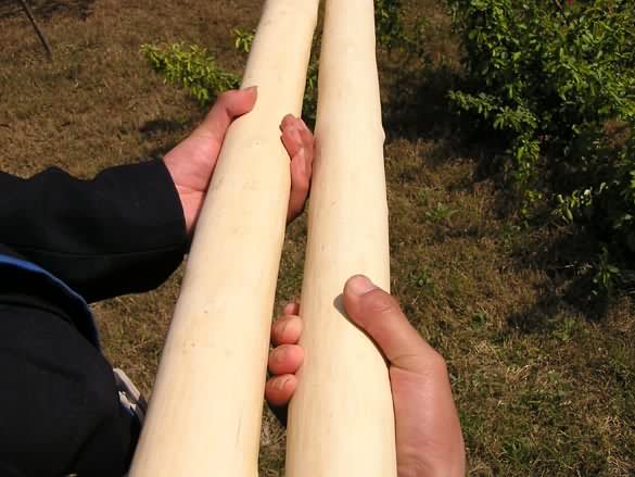 图1: 太极大杆材质为白蜡杆(俗称“白蜡树”,“蜡木杆”等),中华武术各门各派武术器械中从古至今几千年来一直用的就是它!杆身有小大不等、分布不均的小小木疙瘩,使用起来手感超好,不容易脱落,经久耐用,越用越光滑、越用越亮,对练习太极拳缠丝劲、内劲、裆腰臂之爆发力、锻炼耐力及强度有特效,是提高功力、进阶太极高手的必用辅助练功器械!