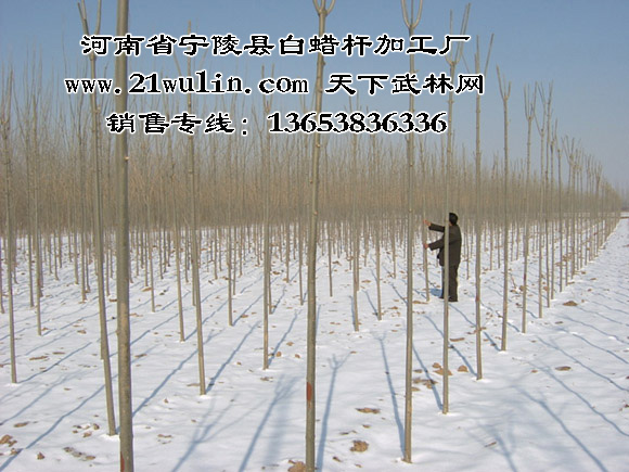 图10:河南省宁陵县白蜡杆加工厂所种植的大杆是由于当地其独特的土质、水质和气候地理特点,所在地阳驿乡有“白蜡杆之乡“之美称,自1995年应全国多位知名武术家的预约订购而专业种植的。精选河边20亩良田,自幼苗种起,进行专业种植管理,其间省农科院藤类植物研究所和宁陵县农技站的专家来种植基地进行参观指导,提出很多种植管理方面的宝贵意见本厂所种植的太极大杆自2004年十月首次砍伐以来,可谓:“十年长一杆”。来到种植基地你会看到一棵棵笔直挺拔、娉婷而立、从不旁逸斜出的白腊树林,笔直度可与高大的大乔木相媲美。其木质柔而不折、坚而不硬,具有“有弹性而折不断,有韧度却不变形,有力度而不震手”等特点。几年来,以其独特的品质、良好的信誉,在广大武术爱好者中树立了很好的口啤,深受国内外武术爱好者青睐。上图为白蜡杆冬季生长阶段
