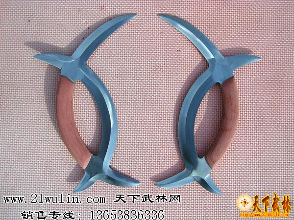 八卦子午鸳鸯钺:由清代董海川先辈所创,是八卦掌中的短器械。津门形意八卦泰斗——张占魁得传后,将此器械名日月乾坤剑,又名鹿角刀,一雌一雄,左钺为乾、右钺为坤,在八卦弧形圈中变化。 走闭开合,穿走九宫八卦。钺为六爪十四刃。此钺用法:钩挂擒拿、割拉、挑扎、闪展、劈剁、撩攒,穿翻截拦,步法的摆扣,钺内藏身,形成津门八卦子午鸳鸯钺特点 。