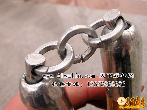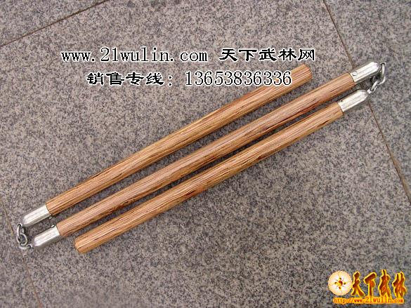 三节棍属武术软器械的一种。它由三条等长的短棍中间以铁环连接而成,又称“三节鞭”。三节棍全长等于习者直立直臂上举至手指尖的高度。因而放开使用如同长器械一般,可作远距离击打。折叠则是一短棍,约同臂长,携带十分方便,常作自卫防身的随身之物。