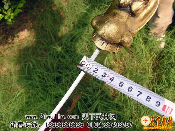 刀头、刀杆、刀尾采用不绣钢材质,刀杆中间打断,用套丝固定牢,刀头和刀杆连接处全部焊死外加铜箍包裹,全为一体,无论如何发力,刀头与刀杆的连接处不会动摇!纯手工制作,刀身上雕有龙,刀头有6-2毫米过渡,重心准确,分量适中,安装后无任何缝隙,质量上乘,外观精美,附送一个黑色皮革携带包,安装、携带极为方便,是练习武术、锻炼身体的好器械,也是店堂陈设、个人收藏的佳品。