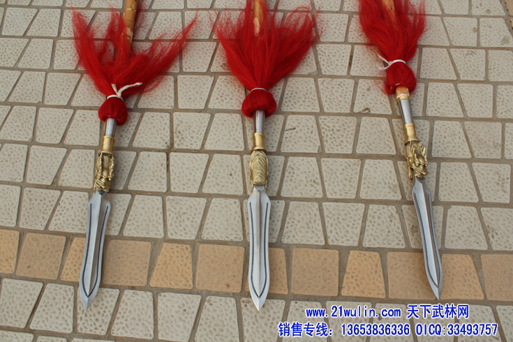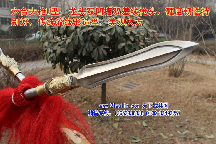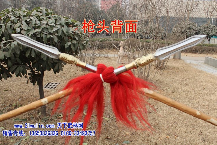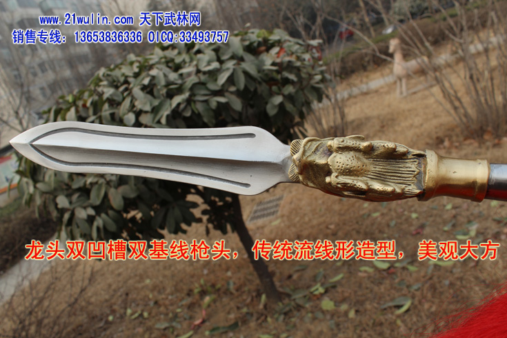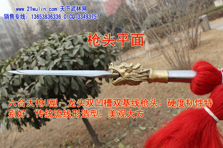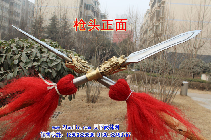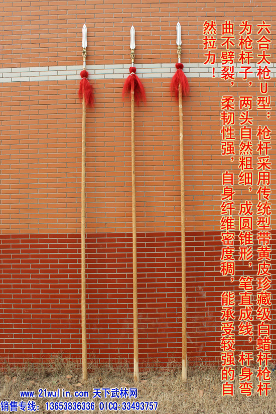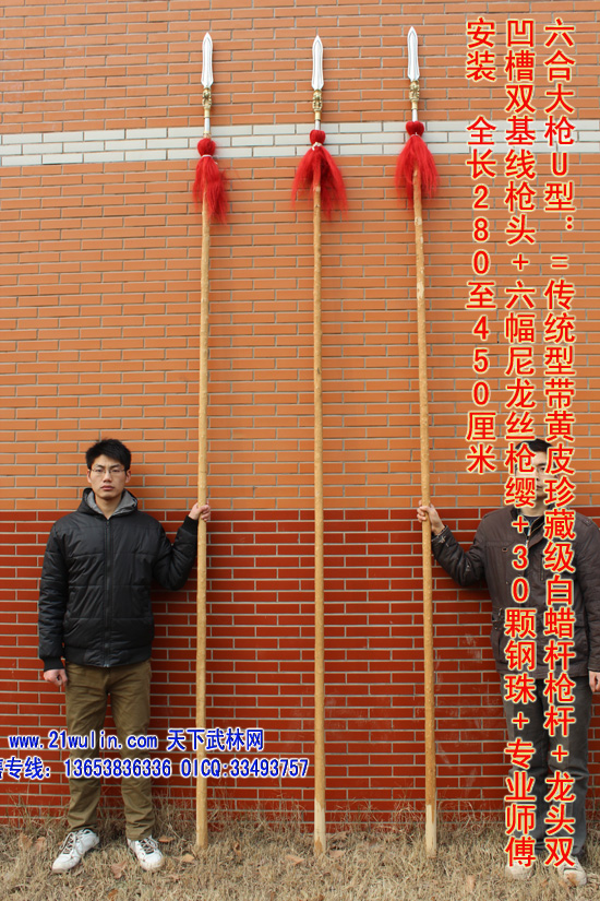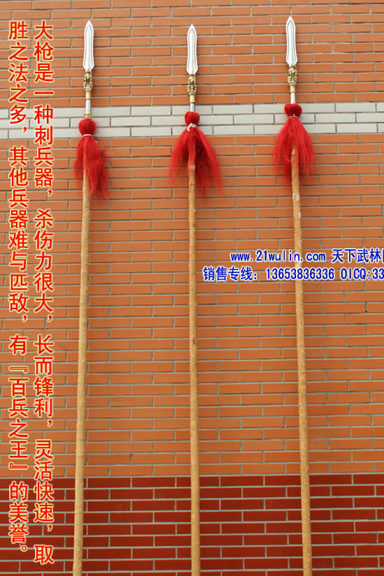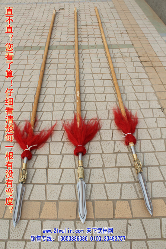 三、大枪材料及价格 材料: 1、枪杆:杆采用传统型带黄皮珍藏级白蜡杆为枪杆子,两头自然粗细,成圆锥形,笔直成线,杆身弯曲不劈裂,柔韧性强,自身纤维密度稠,能承受较强的自然拉力。在干燥的地方不劈裂,在潮湿的地方不变形,其弹性、韧性是其它木质不可比拟的,为最佳武术长器械配杆。 2、大枪头:全为一体双面脊背带凹槽枪头,造型逼真,经久耐用、超级结实,外观造型美观,线形感强 3、枪樱:采用加长加厚四幅胶丝枪樱。 本厂负责免费安装(加安钢珠,木螺丝拧扣)。 本站推荐全长350厘米以上为练大枪的首选长度,整幅大枪的总重量在8斤左右。