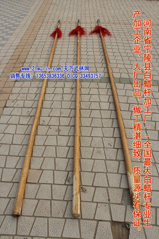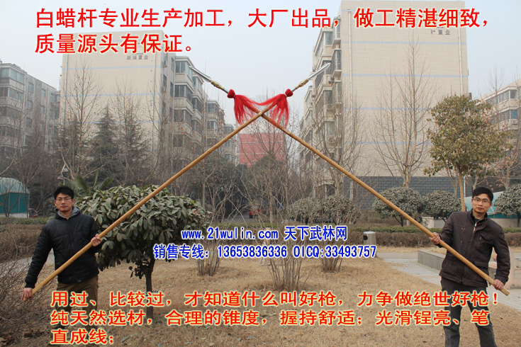 一、关于白蜡杆的介绍 白蜡杆是天然绿色灌木丛生植物,它通体洁白、坚而不硬、柔而不折,杆身可弯曲到180度不劈裂,自身柔韧性强,纤维密度稠,有较强的自然拉力,在干燥的地方不劈裂,在潮湿的地方不变形,其弹性、韧性是其它木质不可比拟的,属绿色、天然、独特、稀有的特产,是加工武术器材及各种工具的理想天然原材料,深受国内外武术爱好者青睐。河南省宁陵县白蜡杆加工厂以“传统的工艺和先进的技术”为动力,充分利用这一独特资源的优势,把白蜡杆有弹性而折不断、有韧度而不变形、有力度而不震手等特性溶入技术开发中去,大胆采取高温熏蒸和现代工艺相结合的办法,彻底杀死深藏的蛀虫,精挑细选,精心加工后的杆子光滑锃亮、笔直成线。 河南省宁陵县白蜡杆加工厂所种植的大杆是由于当地其独特的土质、水质和气候地理特点,所在地阳驿乡有“白蜡杆之乡“之美称,自1995年应全国多位知名武术家的预约订购而专业种植的。精选河边20亩良田,自幼苗种起,进行专业种植管理,其间省农科院藤类植物研究所和宁陵县农技站的专家来种植基地进行参观指导,提出很多种植管理方面的宝贵意见,自2004年十月首次砍伐以来,可谓:“十年长一杆”。来到种植基地你会看到一棵棵笔直挺拔、娉婷而立、从不旁逸斜出的白腊树林,笔直度可与高大的大乔木相媲美。其木质柔而不折、坚而不硬,具有“有弹性而折不断,有韧度却不变形,有力度而不震手”等特点。几年来,以其独特的品质、良好的信誉,在广大武术爱好者中树立了很好的口啤,深受国内外武术爱好者青睐。 二、大枪枪法浅谈 月棍、年刀、一辈子的枪。——老舍《断魂枪》 枪为武术常用器械之一,被称为长兵之帅。由上古矛戈发展演变而成,为中国古代最强的刺兵,历朝历代使枪成为扬名天下、改朝换代、扫荡乾坤的神器,赵云、马超、罗成、李光弼、王彦章、杨家将、林冲、岳飞、戚继光等大名如雷惯耳,非刀、棍可比。 著名的杨家梨花枪,戚继光《纪效新书》介绍此枪法说:“杨家之法,手执枪根,出枪甚长,且有虚实,有奇正;有虚虚实实,有奇奇正正;其进锐,其退速,其势险,其节短;不动如山,动如雷震,故曰二十年梨花枪无敌手。”明何良臣《陈记》、吴殳《手臂录》对枪术作了系统的分析和总结,并对各家流派作了介绍枪术除单练之外,也可与其他武器对练,如大刀进枪、剑进枪、三节棍进枪等。 枪是军器里最博大精深的、最难学的。普通人拿根棒子就知道到处乱敲,给他根枪就不知道怎么办了。枪若使得好的,枪就好象有了生命-“枪似游龙”,古代骁将马踏连营之时,一条枪就把人马团团护住,枪头寒光到处,鬼哭狼嚎。