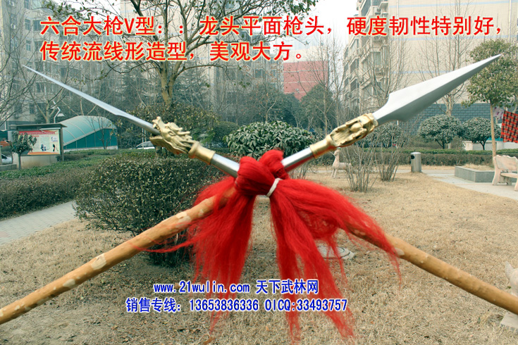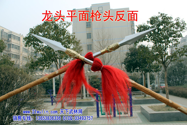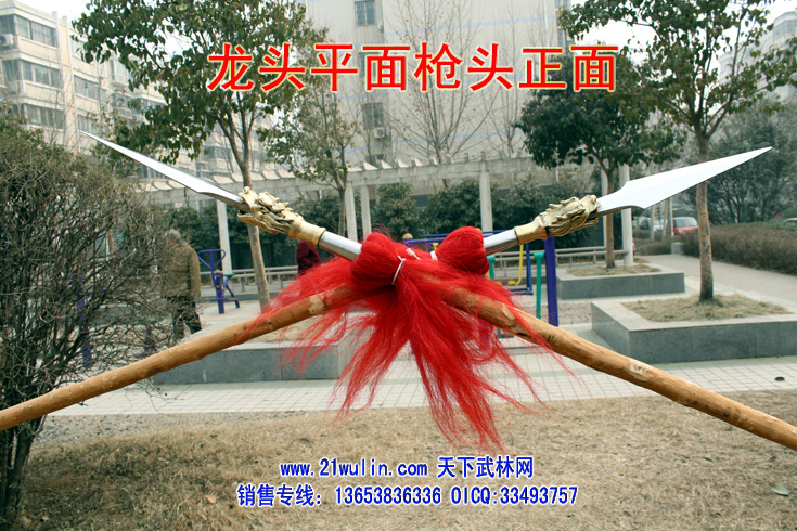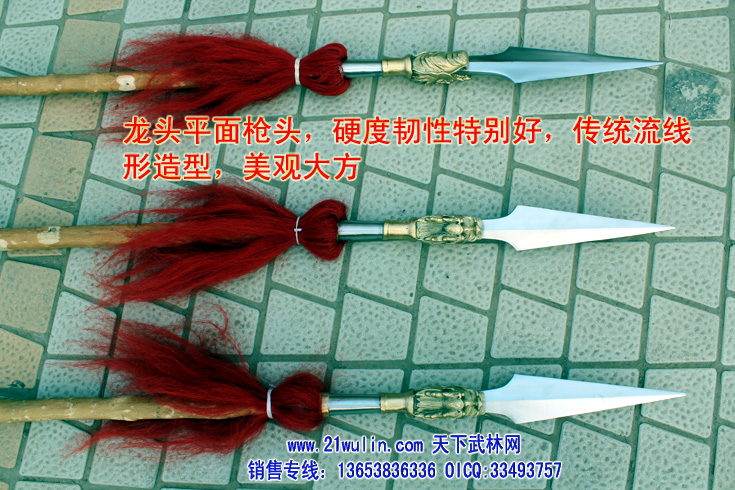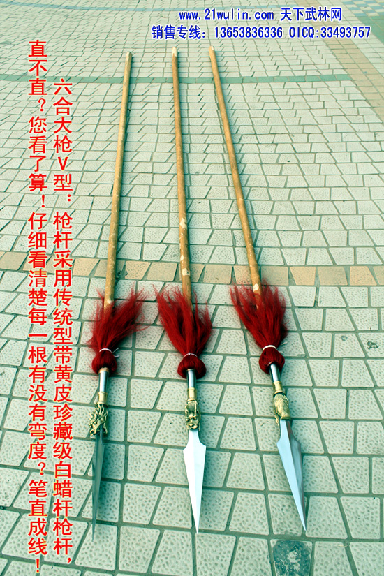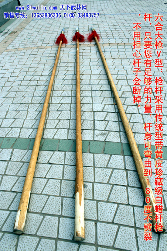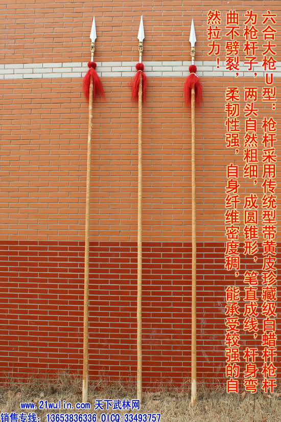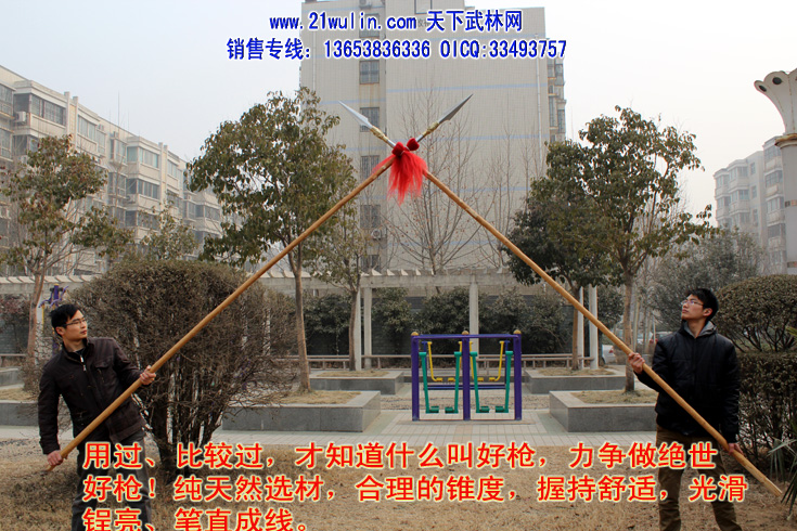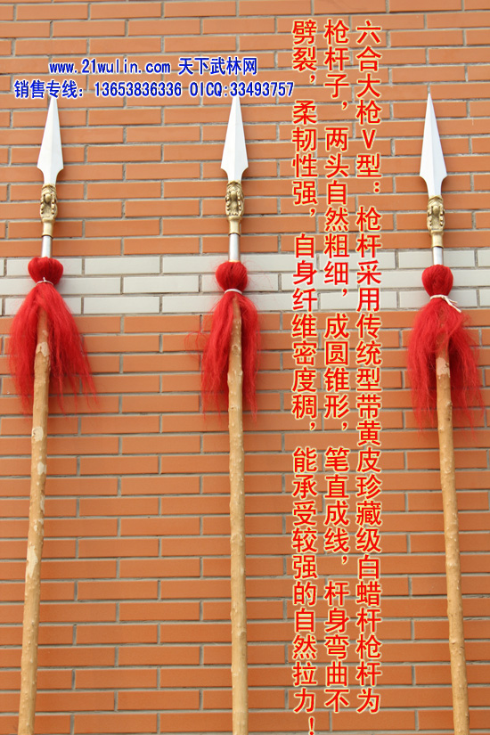 三、大枪材料及价格 材料: 1、枪杆:杆采用传统型带黄皮珍藏级白蜡杆为枪杆子,两头自然粗细,成圆锥形,笔直成线,杆身弯曲不劈裂,柔韧性强,自身纤维密度稠,能承受较强的自然拉力。在干燥的地方不劈裂,在潮湿的地方不变形,其弹性、韧性是其它木质不可比拟的,为最佳武术长器械配杆。 2、大枪头:全为一体双面脊背带凹槽枪头,造型逼真,经久耐用、超级结实,外观造型美观,线形感强 3、枪樱:采用加长加厚四幅胶丝枪樱。 本厂负责免费安装(加安钢珠,木螺丝拧扣)。 本站推荐全长350厘米以上为练大枪的首选长度,整幅大枪的总重量在8斤左右。