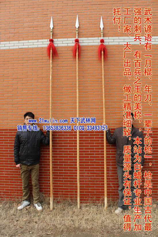 一、关于白蜡杆的介绍 白蜡杆是天然绿色灌木丛生植物,它通体洁白、坚而不硬、柔而不折,杆身可弯曲到180度不劈裂,自身柔韧性强,纤维密度稠,有较强的自然拉力,在干燥的地方不劈裂,在潮湿的地方不变形,其弹性、韧性是其它木质不可比拟的,属绿色、天然、独特、稀有的特产,是加工武术器材及各种工具的理想天然原材料,深受国内外武术爱好者青睐。河南省宁陵县白蜡杆加工厂以“传统的工艺和先进的技术”为动力,充分利用这一独特资源的优势,把白蜡杆有弹性而折不断、有韧度而不变形、有力度而不震手等特性溶入技术开发中去,大胆采取高温熏蒸和现代工艺相结合的办法,彻底杀死深藏的蛀虫,精挑细选,精心加工后的杆子光滑锃亮、笔直成线。 河南省宁陵县白蜡杆加工厂所种植的大杆是由于当地其独特的土质、水质和气候地理特点,所在地阳驿乡有“白蜡杆之乡“之美称,自1995年应全国多位知名武术家的预约订购而专业种植的。精选河边20亩良田,自幼苗种起,进行专业种植管理,其间省农科院藤类植物研究所和宁陵县农技站的专家来种植基地进行参观指导,提出很多种植管理方面的宝贵意见,自2004年十月首次砍伐以来,可谓:“十年长一杆”。来到种植基地你会看到一棵棵笔直挺拔、娉婷而立、从不旁逸斜出的白腊树林,笔直度可与高大的大乔木相媲美。其木质柔而不折、坚而不硬,具有“有弹性而折不断,有韧度却不变形,有力度而不震手”等特点。几年来,以其独特的品质、良好的信誉,在广大武术爱好者中树立了很好的口啤,深受国内外武术爱好者青睐。 二、大枪枪法浅谈 月棍、年刀、一辈子的枪。——老舍《断魂枪》 枪为武术常用器械之一,被称为长兵之帅。由上古矛戈发展演变而成,为中国古代最强的刺兵,历朝历代使枪成为扬名天下、改朝换代、扫荡乾坤的神器,赵云、马超、罗成、李光弼、王彦章、杨家将、林冲、岳飞、戚继光等大名如雷惯耳,非刀、棍可比。 著名的杨家梨花枪,戚继光《纪效新书》介绍此枪法说:“杨家之法,手执枪根,出枪甚长,且有虚实,有奇正;有虚虚实实,有奇奇正正;其进锐,其退速,其势险,其节短;不动如山,动如雷震,故曰二十年梨花枪无敌手。”明何良臣《陈记》、吴殳《手臂录》对枪术作了系统的分析和总结,并对各家流派作了介绍枪术除单练之外,也可与其他武器对练,如大刀进枪、剑进枪、三节棍进枪等。 枪是军器里最博大精深的、最难学的。普通人拿根棒子就知道到处乱敲,给他根枪就不知道怎么办了。枪若使得好的,枪就好象有了生命-“枪似游龙”,古代骁将马踏连营之时,一条枪就把人马团团护住,枪头寒光到处,鬼哭狼嚎。