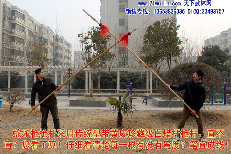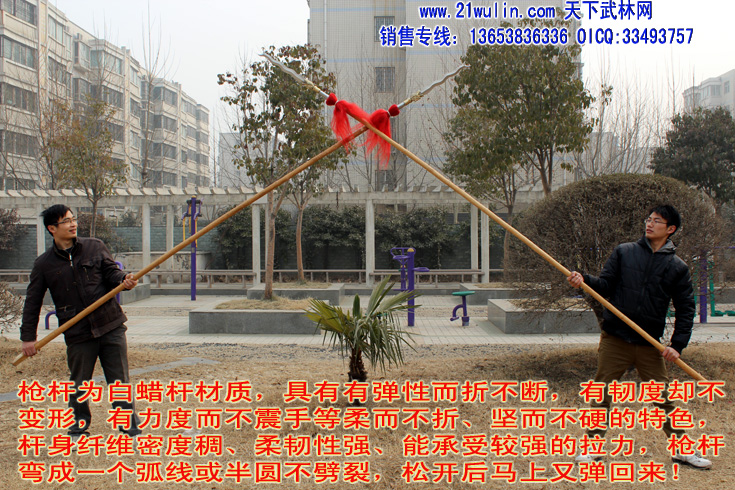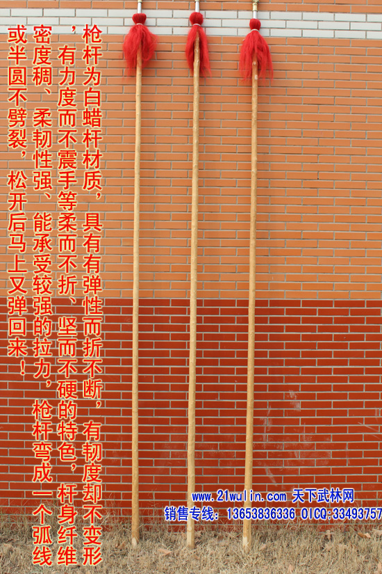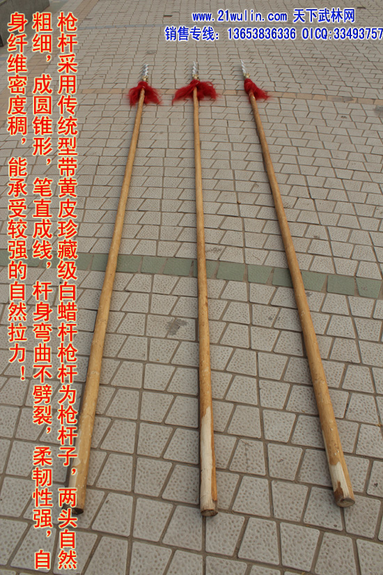1、枪杆:杆采用传统型带黄皮珍藏级白蜡杆为枪杆子,两头自然粗细,成圆锥形,笔直成线,杆身弯曲不劈裂,柔韧性强,自身纤维密度稠,能承受较强的自然拉力。在干燥的地方不劈裂,在潮湿的地方不变形,其弹性、韧性是其它木质不可比拟的,为最佳武术长器械配杆。