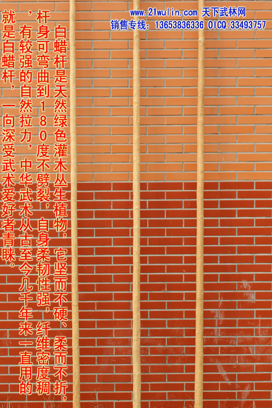 白蜡杆是天然绿色灌木丛生植物,它通体洁白、坚而不硬、柔而不折,杆身可弯曲到180度不劈裂,自身柔韧性强,纤维密度稠,有较强的自然拉力,在干燥的地方不劈裂,在潮湿的地方不变形,其弹性、韧性是其它木质不可比拟的,属绿色、天然、独特、稀有的特产,是加工武术器材及各种工具的理想天然原材料,深受国内外武术爱好者青睐。河南省宁陵县白蜡杆加工厂以“传统的工艺和先进的技术”为动力,充分利用这一独特资源的优势,把白蜡杆有弹性而折不断、有韧度而不变形、有力度而不震手等特性溶入技术开发中去,大胆采取高温熏蒸和现代工艺相结合的办法,彻底杀死深藏的蛀虫,精挑细选,精心加工后的杆子光滑锃亮、笔直成线。