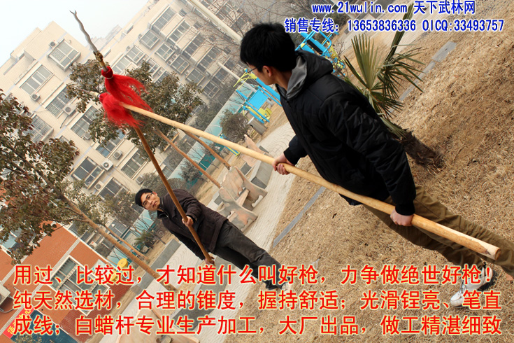 河南省宁陵县白蜡杆加工厂年加工各类白蜡杆在50万根以上,在用做武术器械中长年与各类武术院校及全国知名武术家建立良好的合作关系,宁陵白蜡杆武术棍(枪)的市场占有率在60%以上,其中长3至5米白蜡杆为太极大杆、抖杆、大枪等训练表演专用器械,独家生产的选用整段实木为源材料,全为一体、近乎正圆的纯实木实心太极球系列产品更是风靡武林,已有十多位武术名家在各类武术教学影片讲解演练中使用本产生产的武术器械,充分展示了我厂产品的一流品质。2006年邀请我国著名武术家、《中华武术展现工程》总监---武世俊大师为本厂形象代言人技术顾问、“第一、二届世界传统武术节”、“2007功夫之星全球电视大赛”为国家规定套路的棍术和枪术比赛专用器械、2008年春节晚会舞台上少林弟子使用本厂的武术棍,高难度的表演了“人在棍上翻”的动作给观众留下了深刻的印象,充分展现了白蜡杆坚而不硬、柔而不折的优良品质和我厂的雄厚实力!