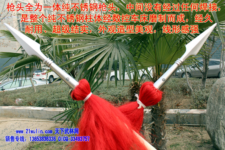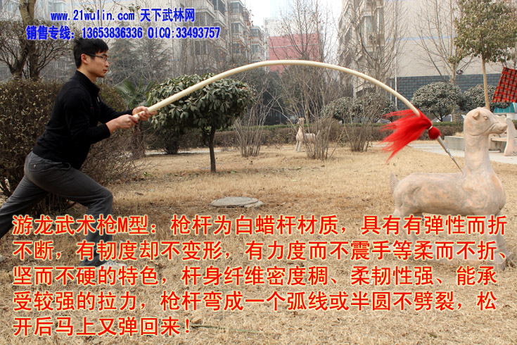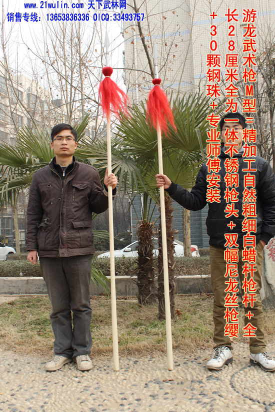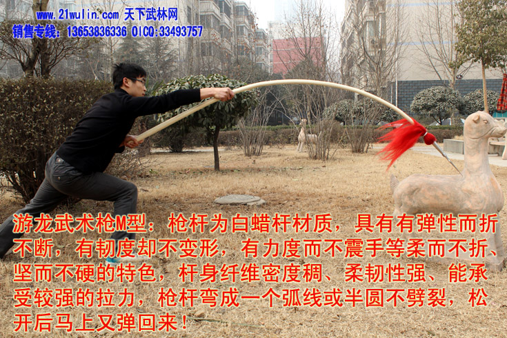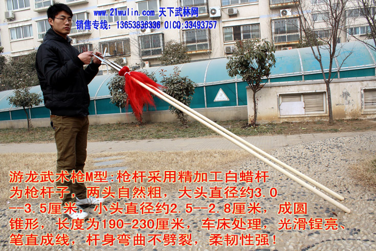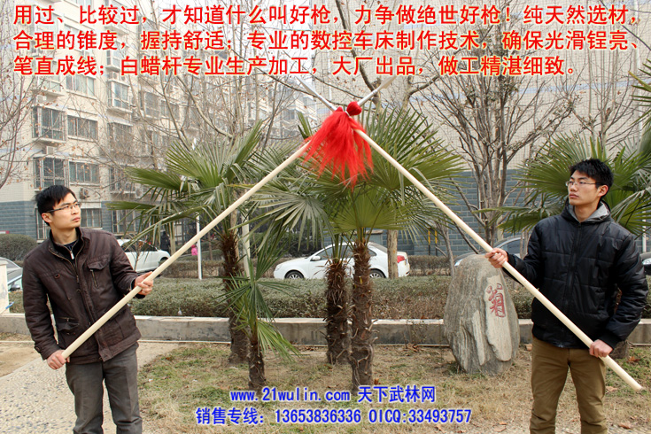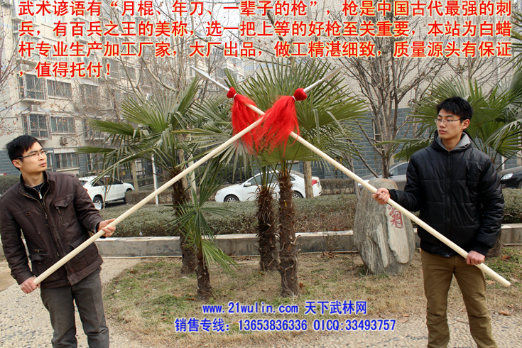 三、大枪材料及价格 材料: 1、枪杆:杆采用传统型带黄皮珍藏级白蜡杆为枪杆子,两头自然粗细,成圆锥形,笔直成线,杆身弯曲不劈裂,柔韧性强,自身纤维密度稠,能承受较强的自然拉力。在干燥的地方不劈裂,在潮湿的地方不变形,其弹性、韧性是其它木质不可比拟的,为最佳武术长器械配杆。 2、大枪头:全为一体双面平槽枪头,造型逼真,经久耐用、超级结实,外观造型美观,线形感强。 3、枪樱:采用加长加厚四幅胶丝枪樱。 本厂负责免费安装(加安钢珠,木螺丝拧扣)。 四、河南省宁陵县白蜡杆加工厂简介 河南省宁陵县白蜡杆加工厂始建于1978年,位于素有“白蜡杆(条)之乡”美誉的豫东平原宁陵县阳驿乡,由于其当地独特的土质、水质和地理气候特点,当地人民创造性地发展种植了白蜡杆,用于防风固沙,防止水土流失。目前宁陵县白蜡条(杆)种植面积在20万亩以上,为“宁陵三宝”之一,并被授予“全国最大白蜡条(杆)生产基地”称号,通过“国家地理标志产品保护”认证。 白蜡杆是天然绿色灌木丛生植物,它通体洁白、坚而不硬、柔而不折,杆身可弯曲到180度不劈裂,自身柔韧性强,纤维密度稠,有较强的自然拉力,在干燥的地方不劈裂,在潮湿的地方不变形,其弹性、韧性是其它木质不可比拟的,属绿色、天然、独特、稀有的特产,是加工武术器材及各种工具的理想天然原材料,深受国内外武术爱好者青睐。河南省宁陵县白蜡杆加工厂以“传统的工艺和先进的技术”为动力,充分利用这一独特资源的优势,把白蜡杆有弹性而折不断、有韧度而不变形、有力度而不震手等特性溶入技术开发中去,大胆采取高温熏蒸和现代工艺相结合的办法,彻底杀死深藏的蛀虫,精挑细选,精心加工后的杆子光滑锃亮、笔直成线。 河南省宁陵县白蜡杆加工厂年加工各类白蜡杆在50万根以上,在用做武术器械中长年与各类武术院校及全国知名武术家建立良好的合作关系,宁陵白蜡杆武术棍(枪)的市场占有率在60%以上,其中长3至5米白蜡杆为太极大杆、抖杆、大枪等训练表演专用器械,独家生产的选用整段实木为源材料,全为一体、近乎正圆的纯实木实心太极球系列产品更是风靡武林,已有十多位武术名家在各类武术教学影片讲解演练中使用本产生产的武术器械,充分展示了我厂产品的一流品质。2006年邀请我国著名武术家、《中华武术展现工程》总监---武世俊大师为本厂形象代言人技术顾问、“第一、二届世界传统武术节”、“2007功夫之星全球电视大赛”为国家规定套路的棍术和枪术比赛专用器械、2008年春节晚会舞台上少林弟子使用本厂的武术棍,高难度的表演了“人在棍上翻”的动作给观众留下了深刻的印象,充分展现了白蜡杆坚而不硬、柔而不折的优良品质和我厂的雄厚实力! 引领纯天然时尚,打造武术器械精品是我厂永恒的原则。在工程项目中与青藏铁路建设指挥部、河南物探院、河南煤矿机械厂、河南高速、郑州铁路局等厂矿企业建立了良好的合作关系。现阶段我厂在原材料、加工工序、规模、数量全国一流,拥有长期稳定大量的货源,我厂将本着诚信、公平、互动、双赢的原则,向全国诚招代理商(经销商),真诚希望您的加盟! 河南省宁陵县白蜡杆加工厂以“质量第一、诚信为本、艰苦创业、开拓进取”为指导思想,以“丰富独特的资源和廉价的技术劳动力”为优势,以“传统的工艺和先进的科学技术”为动力,以“博大的胸怀和诚实的科学态度”为基础,热情欢迎国内外客商来我厂洽谈合作。 河南省宁陵县白蜡杆加工厂欢迎您