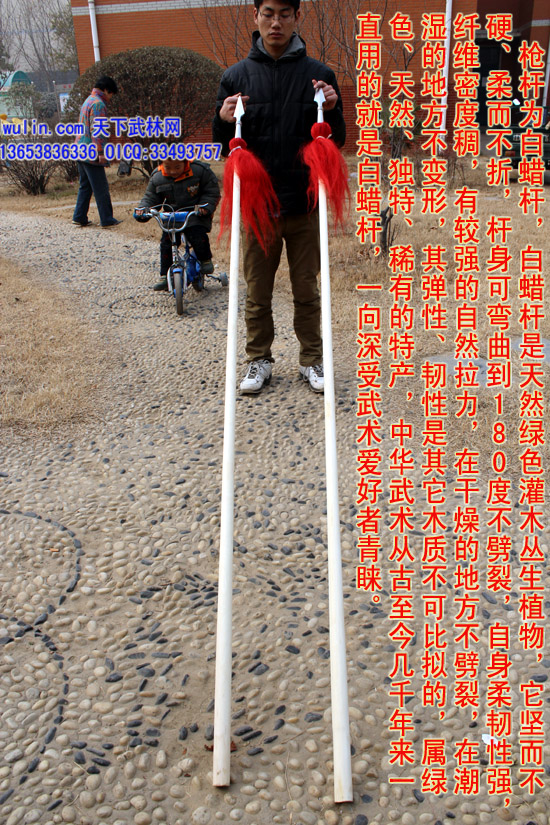一、关于白蜡杆的介绍 白蜡杆是天然绿色灌木丛生植物,它通体洁白、坚而不硬、柔而不折,杆身可弯曲到180度不劈裂,自身柔韧性强,纤维密度稠,有较强的自然拉力,在干燥的地方不劈裂,在潮湿的地方不变形,其弹性、韧性是其它木质不可比拟的,属绿色、天然、独特、稀有的特产,是加工武术器材及各种工具的理想天然原材料,深受国内外武术爱好者青睐。河南省宁陵县白蜡杆加工厂以“传统的工艺和先进的技术”为动力,充分利用这一独特资源的优势,把白蜡杆有弹性而折不断、有韧度而不变形、有力度而不震手等特性溶入技术开发中去,大胆采取高温熏蒸和现代工艺相结合的办法,彻底杀死深藏的蛀虫,精挑细选,精心加工后的杆子光滑锃亮、笔直成线。 河南省宁陵县白蜡杆加工厂所种植的大杆是由于当地其独特的土质、水质和气候地理特点,所在地阳驿乡有“白蜡杆之乡“之美称,自1995年应全国多位知名武术家的预约订购而专业种植的。精选河边20亩良田,自幼苗种起,进行专业种植管理,其间省农科院藤类植物研究所和宁陵县农技站的专家来种植基地进行参观指导,提出很多种植管理方面的宝贵意见,自2004年十月首次砍伐以来,可谓:“十年长一杆”。来到种植基地你会看到一棵棵笔直挺拔、娉婷而立、从不旁逸斜出的白腊树林,笔直度可与高大的大乔木相媲美。其木质柔而不折、坚而不硬,具有“有弹性而折不断,有韧度却不变形,有力度而不震手”等特点。几年来,以其独特的品质、良好的信誉,在广大武术爱好者中树立了很好的口啤,深受国内外武术爱好者青睐。 二、大枪枪法浅谈 月棍、年刀、一辈子的枪。——老舍《断魂枪》 枪为武术常用器械之一,被称为长兵之帅。由上古矛戈发展演变而成,为中国古代最强的刺兵,历朝历代使枪成为扬名天下、改朝换代、扫荡乾坤的神器,赵云、马超、罗成、李光弼、王彦章、杨家将、林冲、岳飞、戚继光等大名如雷惯耳,非刀、棍可比。 著名的杨家梨花枪,戚继光《纪效新书》介绍此枪法说:“杨家之法,手执枪根,出枪甚长,且有虚实,有奇正;有虚虚实实,有奇奇正正;其进锐,其退速,其势险,其节短;不动如山,动如雷震,故曰二十年梨花枪无敌手。”明何良臣《陈记》、吴殳《手臂录》对枪术作了系统的分析和总结,并对各家流派作了介绍枪术除单练之外,也可与其他武器对练,如大刀进枪、剑进枪、三节棍进枪等。 枪是军器里最博大精深的、最难学的。普通人拿根棒子就知道到处乱敲,给他根枪就不知道怎么办了。枪若使得好的,枪就好象有了生命-“枪似游龙”,古代骁将马踏连营之时,一条枪就把人马团团护住,枪头寒光到处,鬼哭狼嚎。