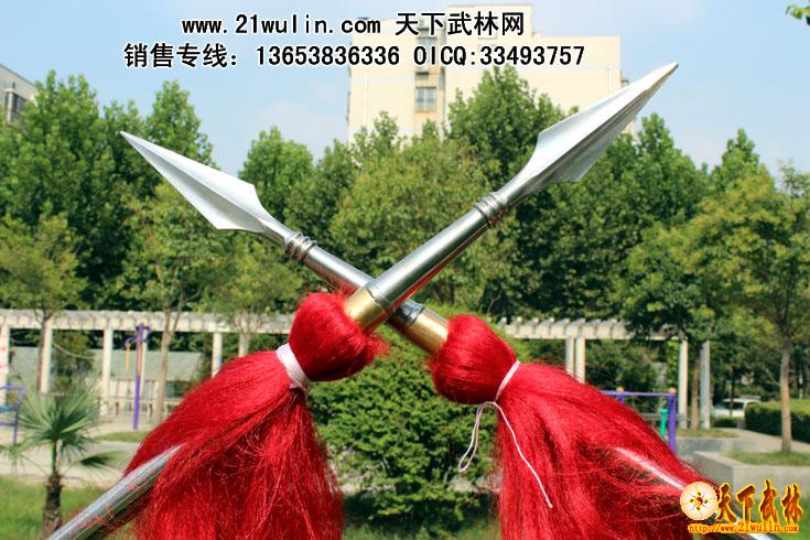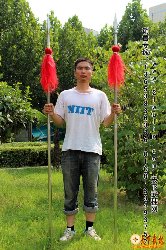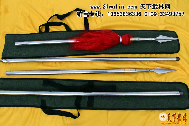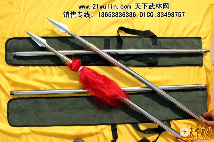| 品名:折叠式全不锈钢武术枪 全长:215-230厘米 总重:5-6斤左右 枪头长:30厘米 枪头材料:全为一体纯不锈钢枪头,中间没有经过任何焊接,是整个纯不锈钢柱体经数控车床磨制而长,经久耐用、超级结实,外观造型美观,线形感强,长30厘米。 枪头最宽度:5厘米 枪后柄长:10厘米 节数:可拆卸两节 折叠后全长:110厘米左右 枪管直径:3.0厘米 枪管材料:全身不锈钢打造 枪缨:四幅红色枪缨 枪背包:加厚绿色帆布 价格:480元,全国包邮!