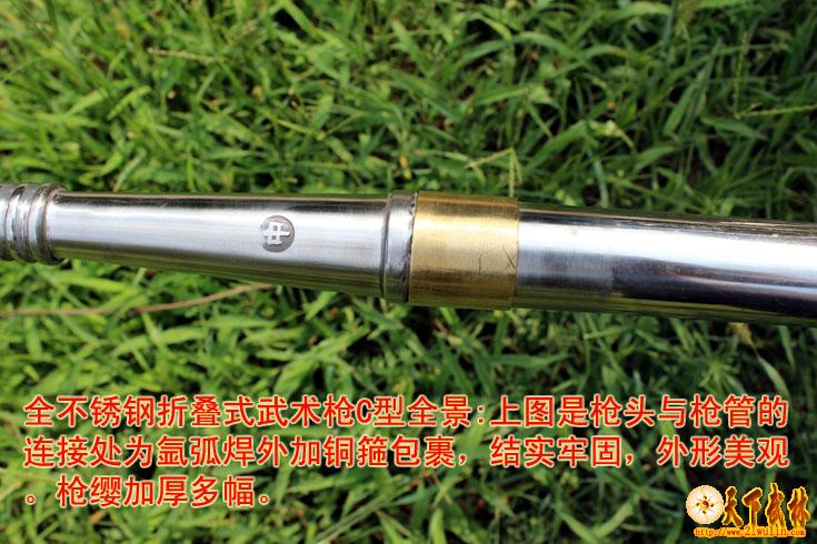 全不锈钢折叠式武术枪C型全景:上图是枪头与枪管的连接处为氩弧焊外加铜箍包裹,结实牢固,外形美观。枪缨加厚多幅。