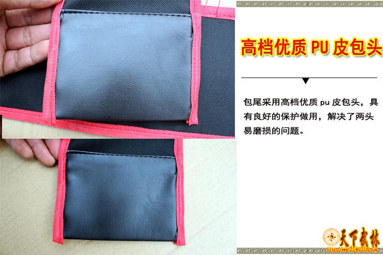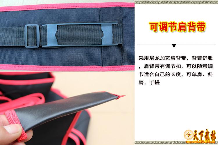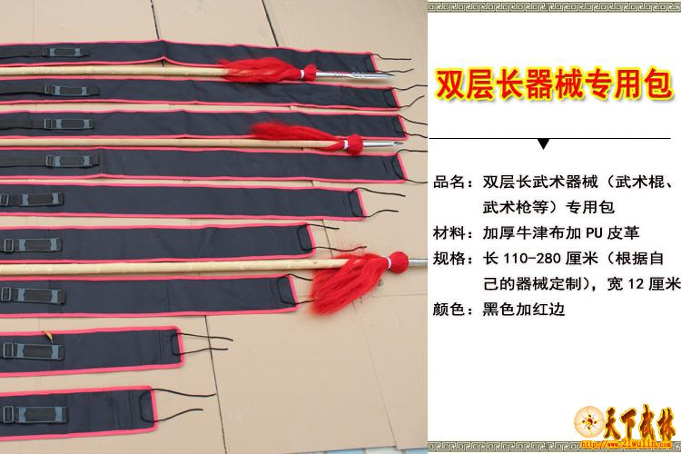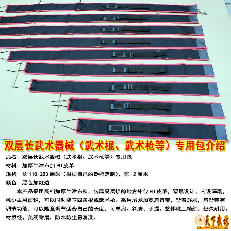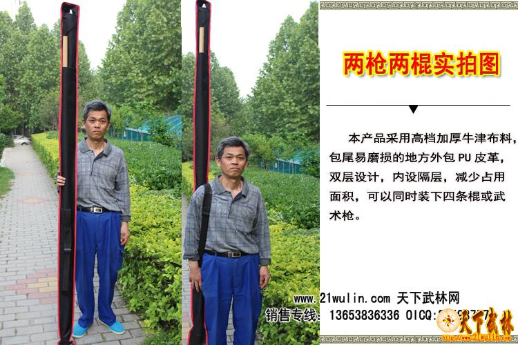 本产品采用高档加厚牛津布料,包尾易磨损的地方外包PU皮革,双层设计,内设隔层,减少占用面积,可以同时装下四条棍或武术枪。采用尼龙加宽肩背带,背着舒服,肩背带有调节功能,可以随意调节适合自己的长度,可单肩、斜胯、手提。整体做工精细,经久耐用。材质经,美观耐磨,防水防尘易清洗。