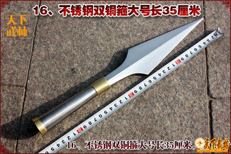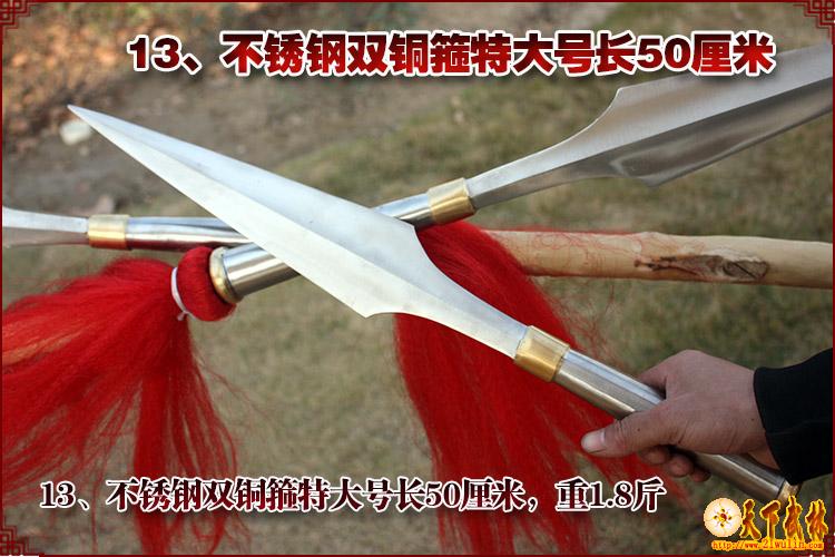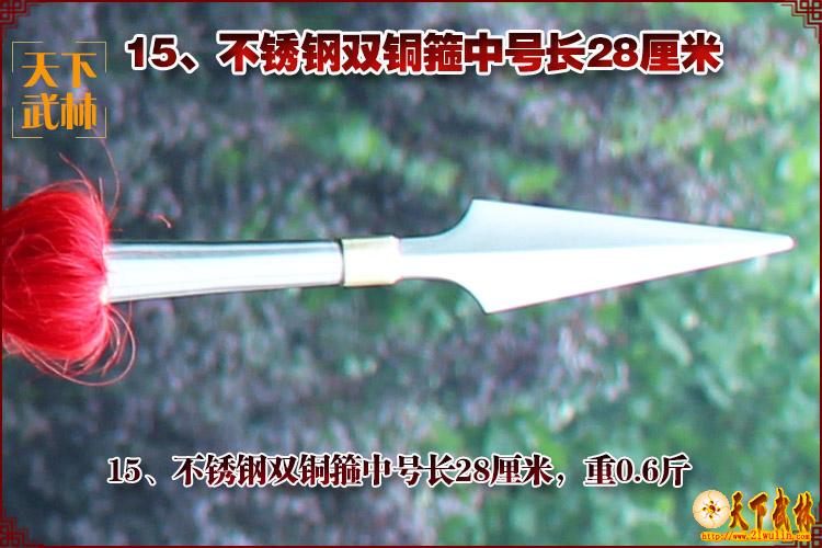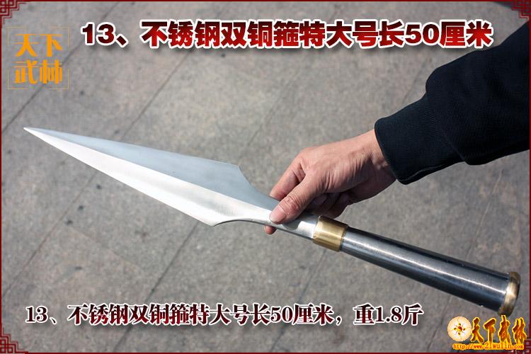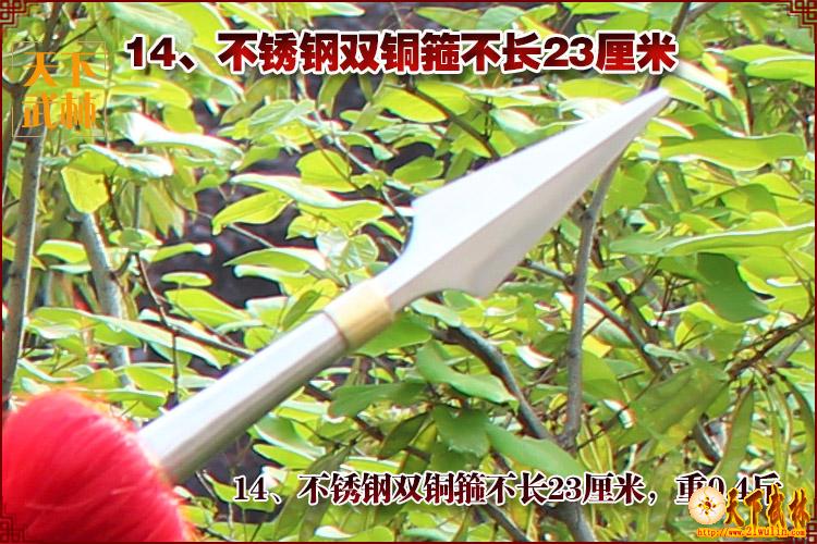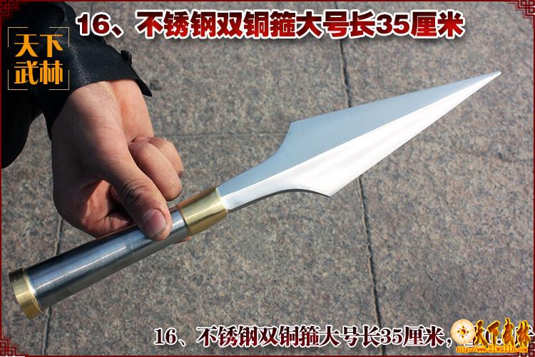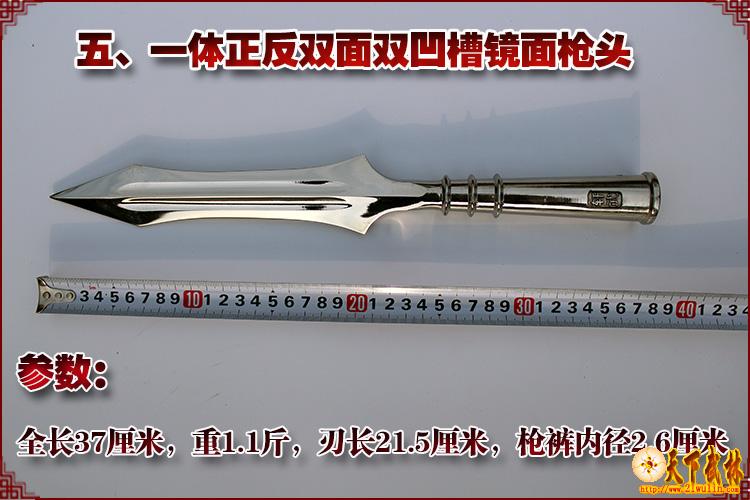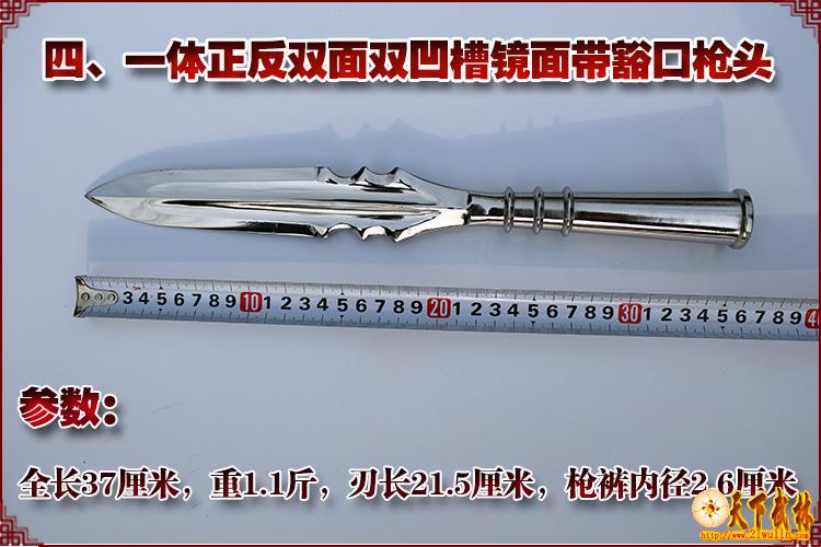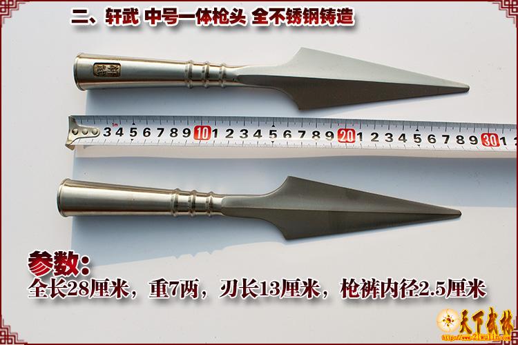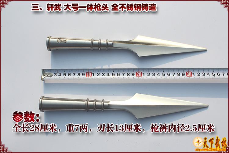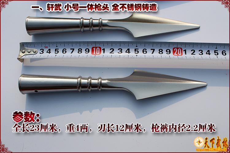 独家一体锻打武术枪头,全不锈钢。淬火,可破盔甲,不锈钢二铬十三是很硬的钢材,有韧性有钢性,是做武术器材很好的材料。也叫磨具刚。有磁性。承诺不满意就退货。买就送三片化纤枪樱子,螺丝。 天下武林枪头,外观造型简洁大方美观,线形层次感强,枪头风格威风凛凛,典雅奢华、光彩照人,经久耐用。