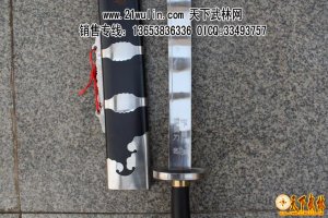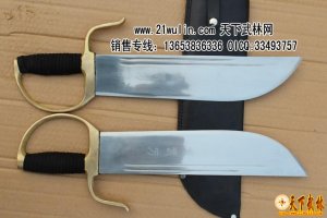 简介】本店商品均实物拍摄,细节清晰,可仔细比较 【硬度】57(HRC) 最宽处11cm,最窄处5.5cm,刃长66cm,全长98cm 【刃材】高碳钢 【重量】5-6斤 【装具】铜 【柄材】铁心加黑色棉带 【其他】手工产品,稍有差别,请以实物为准
