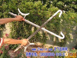峨嵋刺,中国奇门兵器之一,环扣的特殊设计可以使你在攻击中不用担心在遭受攻击中被击落,两头的刺尖真正的诠释了何谓一寸短,一寸险。 材料:钢制 规格:长31CM 此为一对的价格