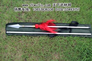 品名:折叠式全不锈钢武术枪 全长:215厘米 总重:4-5斤左右 枪头长:35厘米 枪头材料:纯不锈钢 铜箍长度:4厘米 枪头最宽度:5厘米 枪后柄长:6厘米 节数:可拆卸两节 折叠后全长:110厘米 枪管直径:2.5厘米 枪管材料:全身不锈钢打造 枪缨:双幅红色枪缨 枪背包: