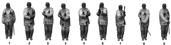 两脚并拢,身体自然站立,左手握棍,棍头朝上,棍尾朝下背于身后,右手五指并拢自然垂于身体右侧,目视前方。此时,三心扫,四相空,一气浑沦,无所意向,呈立正姿势即无极势(图1)。