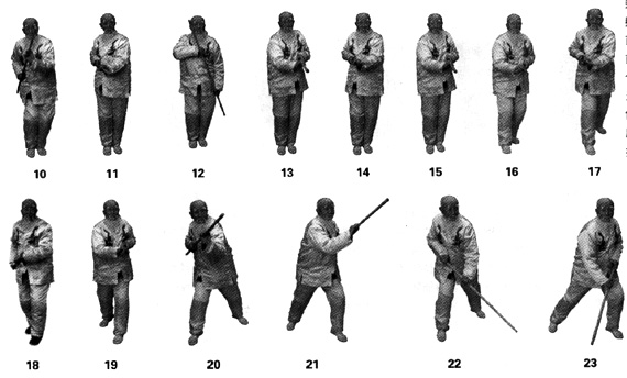 由预备势起,左手握棍,棍尾由下向上从左腰侧向前上举与肋平,右手由右腰侧抬起接棍向前滑把于棍中端,两虎口相对呈阴把持棍势,同时,丹田内扣,含胸夹乳,两腿微曲,身体缓缓下势,头微仰呈束身势,静立片刻,重心移于左腿,右脚置于左脚前呈右虚灵步(同图16);上动微停,丹田翻滚,内催胸,下催膝,左脚蹬,左膝弯绷,右脚向前迈进一步踩出呈右虎步,右手持棍扳扣回拉于右腰侧,左手握棍前推滑把回抽随展身向前下方抖出,劲达棍头(图22)。承接上势,右脚前寸,重心移于右腿,左脚过右脚向前迈进一步置于右脚前呈左虚灵步,左手握棍向前滑把下押于心齐,右手持棍于右腰侧,丹田内扣,含胸夹乳,两腿微曲,身体缓缓下势,头微仰呈束身势(同图18);上动微停,丹田翻滚,内催胸,下催膝,右膝弯绷,右脚蹬,左脚向前迈进一步踩出呈左虎步,左手握棍扳扣回拉于左腰侧,右手持棍前推滑把回抽随展身向前下方抖出,劲达棍尾(图23)。如此循环前进数步,然后,以两脚为轴转身180度,继续练习至起始地,以两脚为轴转身180度,右脚向左脚并拢,右手交棍于左手,身体缓缓直立,气归丹田,收功。