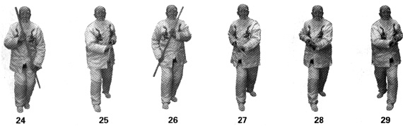 由预备势起,左手握棍,手腕上翻,手心朝外,棍尾沿顺时针方向斜立圆划弧竖于右肩前,右手接棍于右胸前,手心朝前,丹田内扣,含胸夹乳,两腿微曲,身体缓缓下势,头微仰呈束身势,静立片刻,重心移于左腿,右脚置于左脚前呈右虚灵步(图24);上动微停,丹田翻滚,内催胸,下催膝,左膝弯绷,左脚蹬,右脚向前迈进一步踩出呈虎步,右手持棍向丹田处滑把回抽随展身下押与心齐,左手握棍回拉于左腰侧(图25)。承接上势,左手握棍,手腕上翻,手心朝前,棍头沿顺时针方向斜立圆划弧上推于左胸前,右手持棍回拉于右腰侧,手心朝里,丹田内扣,含胸夹乳,两腿微曲,身体缓缓下势,头微仰呈束身势,静立片刻,重心移于右腿,左脚置于右脚前呈左虚灵步(图26);上动微停,丹田翻滚,内催胸,下催膝,右膝弯绷,右脚蹬,左脚向前迈进一步踩出展身呈左虎步,左手握棍向丹田处滑把回抽随展身下押与心齐,右手持棍于右腰侧(图27)。如此循环前进数步,然后,以两脚为轴转身180度,继续练习至起始地,以两脚为轴转身180度,右脚向左脚并拢,右手交棍于左手,身体缓缓直立,气归丹田,收功。