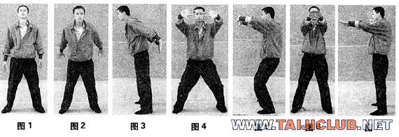 1、以脚分开与肩同宽,双手自然垂放于身体两侧,掌心向内,双腿膝关节略向下弯曲,双眼向正前方平视,全身放松(图1)。2、双手同时向身体后方摆动,掌心向后,手指分开,速度不可太快,身体略前倾,重心移向双脚脚掌。随双手向后摆动同时,以鼻深长、缓慢吸气,双手停止时,吸气亦停止(图2、3侧视)。3、双手以最快的速度由身体左右两侧向前上方以弧线轨迹发力,双手十指相对,掌心向外,形成合劲,肘关节弯曲,不可过于伸直,双手十指及腕关节,在发力的最后瞬间用力绷紧。双腿膝关节向下曲蹲成高马步姿势,双脚脚趾用力抓地,全身肌肉于瞬间用力绷紧,在完成以上动作的同时,以鼻腔快速喷气,并由丹田(即小腹)震荡发出“哼”的一声,以声催力,内外相合(图4、5侧视)。4、以上动作完成后,立即放松,接着双手继续向后摆动,双腿膝关节伸直上挺,身体重心前移。如此反复练习。