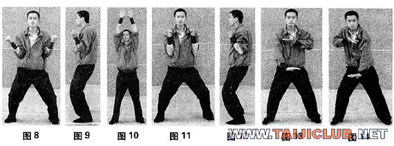 1、双脚左右分开与肩同宽,双手自然下垂于身体两侧,全身放松(同图1)。2、双手由身体两侧平行向上抬起,双手并拢,掌心向前;双臂伸直,同时配合深长吸气(图10)。3、双手用力握拳屈臂下拽,双肘紧夹两肋,拳心相对,双手发力下拽同时,双腿屈膝下蹲成高马步姿势,全身肌肉于瞬间用力绷紧,以鼻喷气发声(图11、12侧视)。4、随即马上放松,接着双手直接由胸前向头顶上方伸出,同时配合深长吸气。如此反复练习。