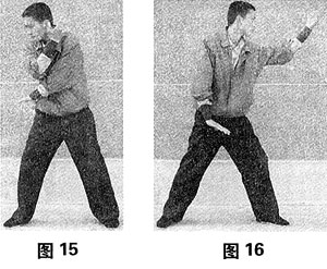 1、双脚左右分开与肩同宽,双手自然下垂于身体两侧,全身放松(同图1)。2、以腰为轴由左向右拧转,带动左手向右下方置于右腿前方,手心向内,左肩内扣并略下沉,右手同时上提至左下颌处,头部随身体转向右下方,双眼向下看左手,左腿向右拧转,以前脚掌支撑,脚跟微抬,膝关节略向下弯曲,前顶。右脚脚趾抓地站牢,膝关节略向下弯曲,并有向内拧裹之力(图15)。3、以腰为轴向左快速拧转,带动左手向左上方发力,手心向上,腕关节用力绷紧,肘关节伸直。头部随之向左上方拧转,目视左手,右手同时向右下方发力,掌心向下按于右胯处,与左手对争用力。右腿随左手向斜上方发力同时蹬地拧转,膝关节伸直,催动身体向左发力,左腿则以前脚掌拧转,带动左腿转动,脚跟于发力瞬间向下踩踏,全身肌肉瞬间用力绷紧,以鼻喷气发声(图16)。4、随即马上放松,接着右手向左下方置于左腿下方,左手上提至右下颌处,准备练习右手。如此反复练习。