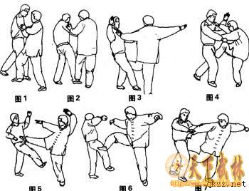 1、我以静待动,静观其变。对方见我守势严密欲抽身走脱,我则立即右脚向前迈进一步,迅速用右顺步拳冲打对方的胸部心坎穴,劲猛力雄气势逼人;对方见我招势凶猛,急将左脚向后撤步,闪避我之锋锐;同时,立即右掌由下向左上前方拧臂钻穿格栏我右臂,并顺势内旋腕捋扣我左腕;左手亦由前右推抓我左肘关节,欲施擒拿法制我或用脚准备踢我时,我则把握时机,借其力,顺其势,迅速左转体,借拧腰转跨之势,用右脚后跟着力猛力挑击对方的裆部,快速灵活,劲力凶猛,目势对方。(图7)