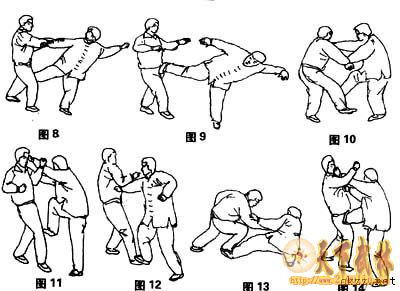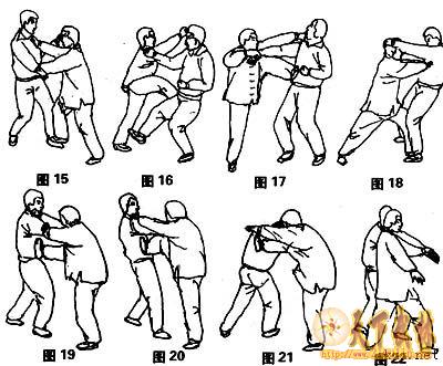 变化之二:当我用右脚踹踢,右反背拳砸其面部时,对方必欲脱逃或忙于招架,我则右脚顺势向下踩踏对方的脚面;同时,我速转体进左步于对方的左腿后,左掌顺势插入对方右臂下贴靠其身,猛地左转体,用腰力将对方摔跌;若对方急沉肩坠肘并用左手推我右臂时,右腿往后抽身撤步,我则速提右脚向前勾踢对方裆部或趋踹对方左腿迎面骨,均能致敌伤残。惟此式重在变化灵活,得机而使,则战无不胜矣。