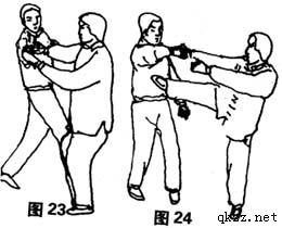 3、上动不停,对方见我上拿下捌蹬,急将右腿回抽,左手搬握我右腕欲解脱之;此时,我则立即顺其势用右掌虚刺对方面部;以挠乱对方视线,分散其注意力,同时,急起右脚左转体,借拧腰转胯之势,迅速向右前言蹬踢对方的胸部或腹部或胯部,均可将对方击倒,目视对方(图24)。