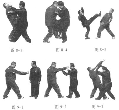 设对方用右掌击我,我上左步闪开对方右掌的同时上右步,左掌外旋前伸,化贴对方左肘,右掌外旋,于左掌下翻压对方右臂,上右足,双掌同时向前上推击对方下颌(图8-1、2、3),提右膝撞击对方裆部(可撞击腹部),如对方撤步,则顺势踢其胸(图8-4、5)。左右式动作相同,唯方向相反。