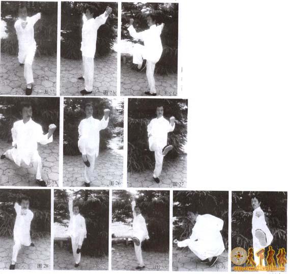 右腿收回提起,左腿挺膝直守,成左金鸡独守势。上肢姿势不变,目视左掌(图26)。