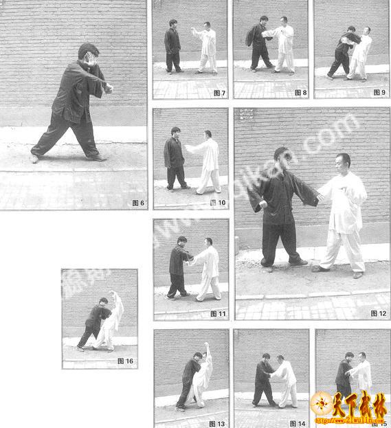 四、实战练习--是将前人在实战中曾经运用过的有效攻击手段总结出来,通过反复练习,再正确用于实战。下面是两种常用的栽拳攻防方法: