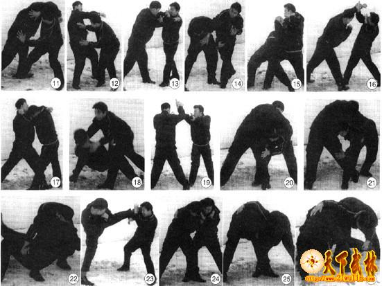 提示:右臂在格挡的时候要极力上挑,以拖延其腿下落的时间,免其逃脱;抄托其腿肘以膝关节下部为准;旋身快,进步到位,撞顶发力以寸劲为主。