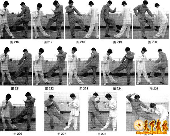 提示:双手动作次序分明,手法准确、到位,劲力轻、重、快、慢适当;侧身挑靠要发力迅猛,刚劲火爆,抖放时以发力吐气为辅助,外放要远。