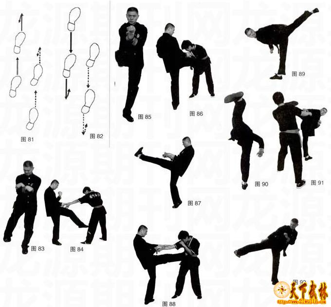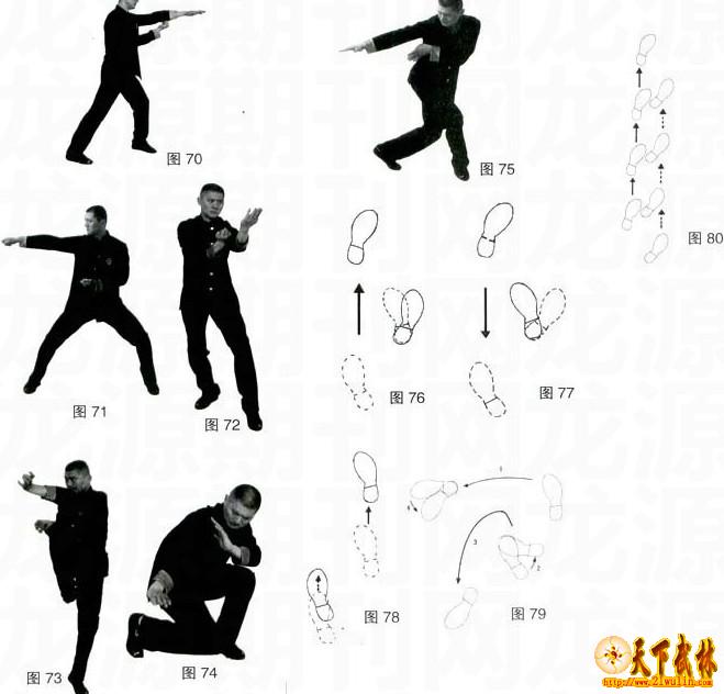 5 追步:前脚连续碎步向前踏出,后脚随之连续跟上踩在前脚步位(图80)。