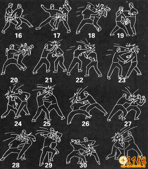 9、掌击股部:以掌重击敌尾椎骨或会阴穴可致敌残伤并可致其于数秒钟之内休克或死亡,如击打其裆部可致其膀胱生殖器破裂,流血不止疼痛难忍甚至当场毙命(图30)。