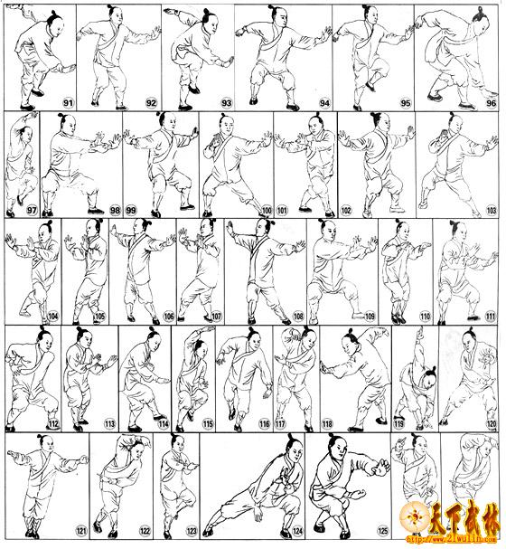 (4)提左足,伸左臂,扬右臂于后,落步,进左步,左掌下穿(如图86——97)。