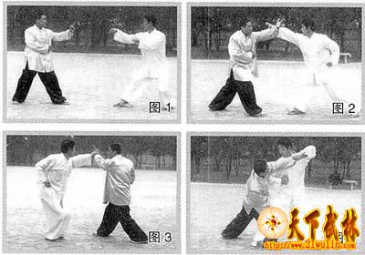 要点:甲方采按乙方的腕、肘,力点在双手,左脚上步要快,勾乙方的脚使其不能逃脱,推击掌与勾脚向相反方向用力,形成合力乙方必被击倒。