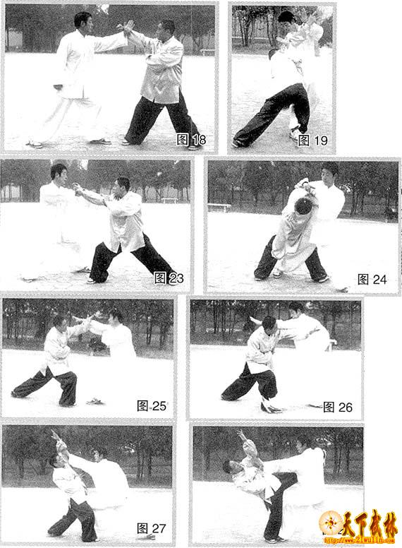 动作说明:1.乙方用右拳或掌击打甲方的中上部,甲方出左手招架(图18)。