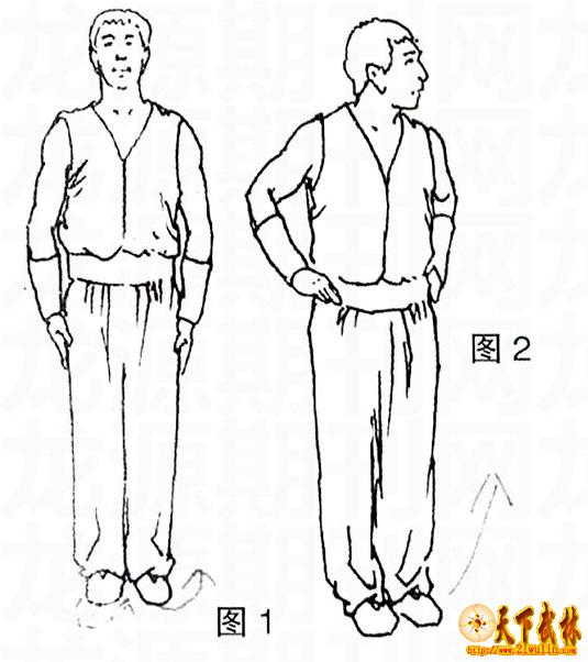 左脚后退半步向右脚并拢,两腿同时伸直站起,两臂自然下垂于体侧,两眼平视前方。(图53)