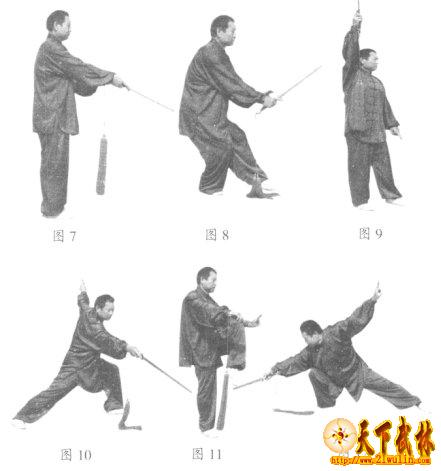 3、并步下刺:身体直起,左脚向前上步,右脚跟进呈并步。右手持剑向前下方刺出,左手剑指附于右手腕处。面向东,目视前方。(图7)