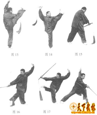 11、望月平衡:左脚落地,身体左转半周,右手持剑下落使剑尖向后,左手剑指附于右手腕(图15)。右脚上步后身体右转半周的同时,右手持剑,右臂外旋,以腕关节为轴,使剑由身体右侧向上向前圆形绕行一周后,向右后下方刺出,左手剑指在左侧平举(图16)。左腿朝后上方抬起,右手持剑反撩至头顶上方架起,剑尖向前。左手剑指在前方上举。面向南,目视后方(图17)。