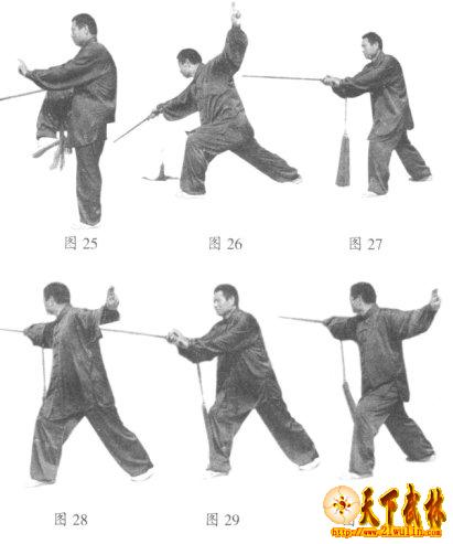 15、回身下刺:两腿不动,身体左转,右手持剑外旋,使剑尖向上再向前下方刺出,左手剑指从右向下向后伸出。面向西,目视剑尖。(22)