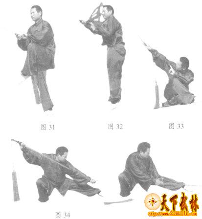 20、提膝抱剑:右脚向后退一步,左腿提膝的同时,右手持剑抱于胸前,左手剑指附于右手腕。面向西北,目视剑尖。(图31)