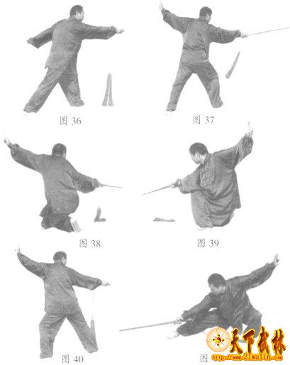 24、仆步下劈:身体直起,左脚向后撤一步,身体左转的同时,右手持剑内旋,使剑尖向左后下刺(图39)。身体右转,右脚向后撤一步的同时,右手持剑外旋,使剑尖从上向前向右后直刺(图40)。身体左转,左脚向后撤一步,左腿屈膝全蹲呈仆步的同时,右手持剑从上向下直劈,左手剑指向后平伸。面向东北,目视剑尖。(图41)(待续)